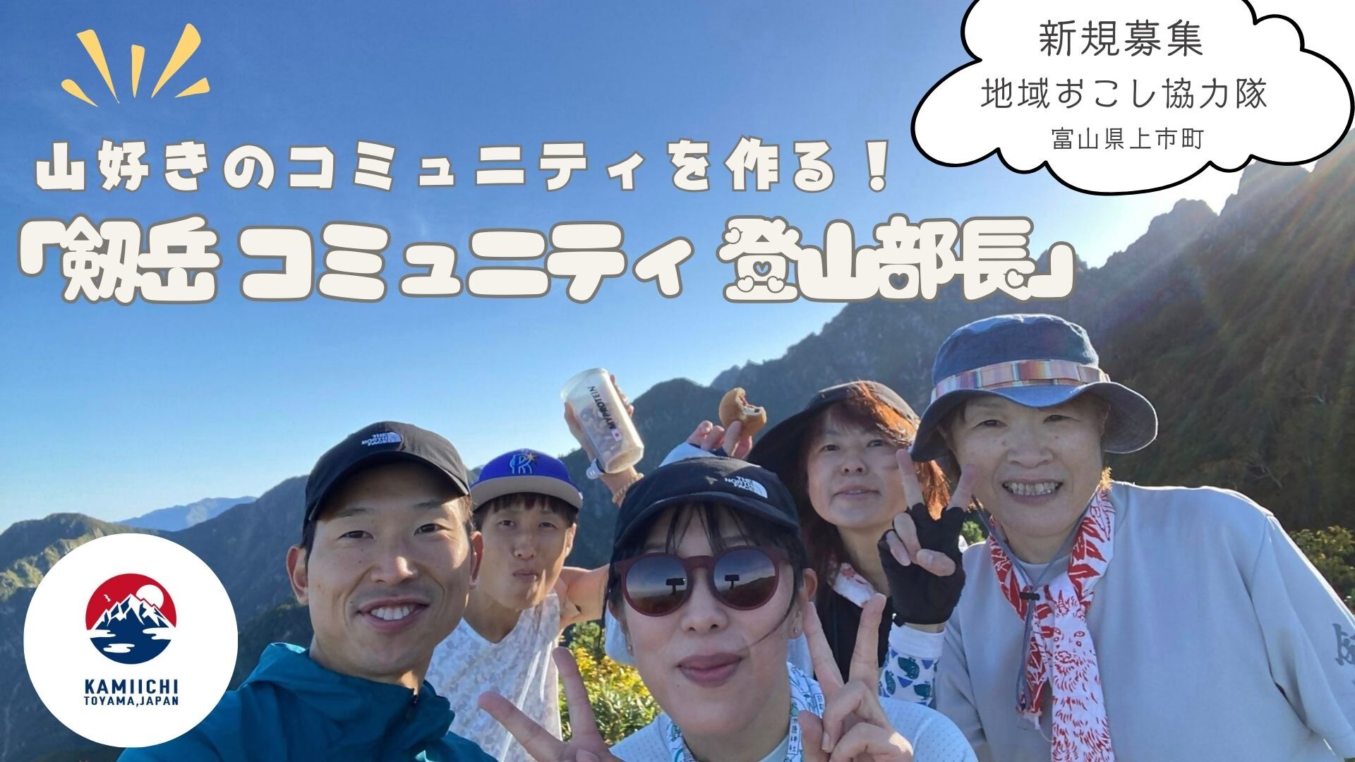 「とっておきの秘密基地」と言われる上市町は、富山県の東側に位置し、町のシンボルである名峰・剱岳(標高2,999m)をはじめ、北アルプスの山々を間近に仰ぐ緑豊かな田園工業都市です。 上市町には12のトレッキングルートがあります。 ひとりで朝から登ることもできますし、子どもの成長に合わせて、家族で、あるいは仲間と、山菜採りやキャンプ・スキーを楽しむこともできます。 一年中、一生、山を楽しむ暮らしができます。 今回の募集では、山好きのコミュニティを作り、上市町の山の楽しみ方をSNSで発信してくれる隊員を募集します。山に登って、山に登って、山に登って・・・山のある上市町の豊かな暮らしに、多くの人を巻き込んでください!