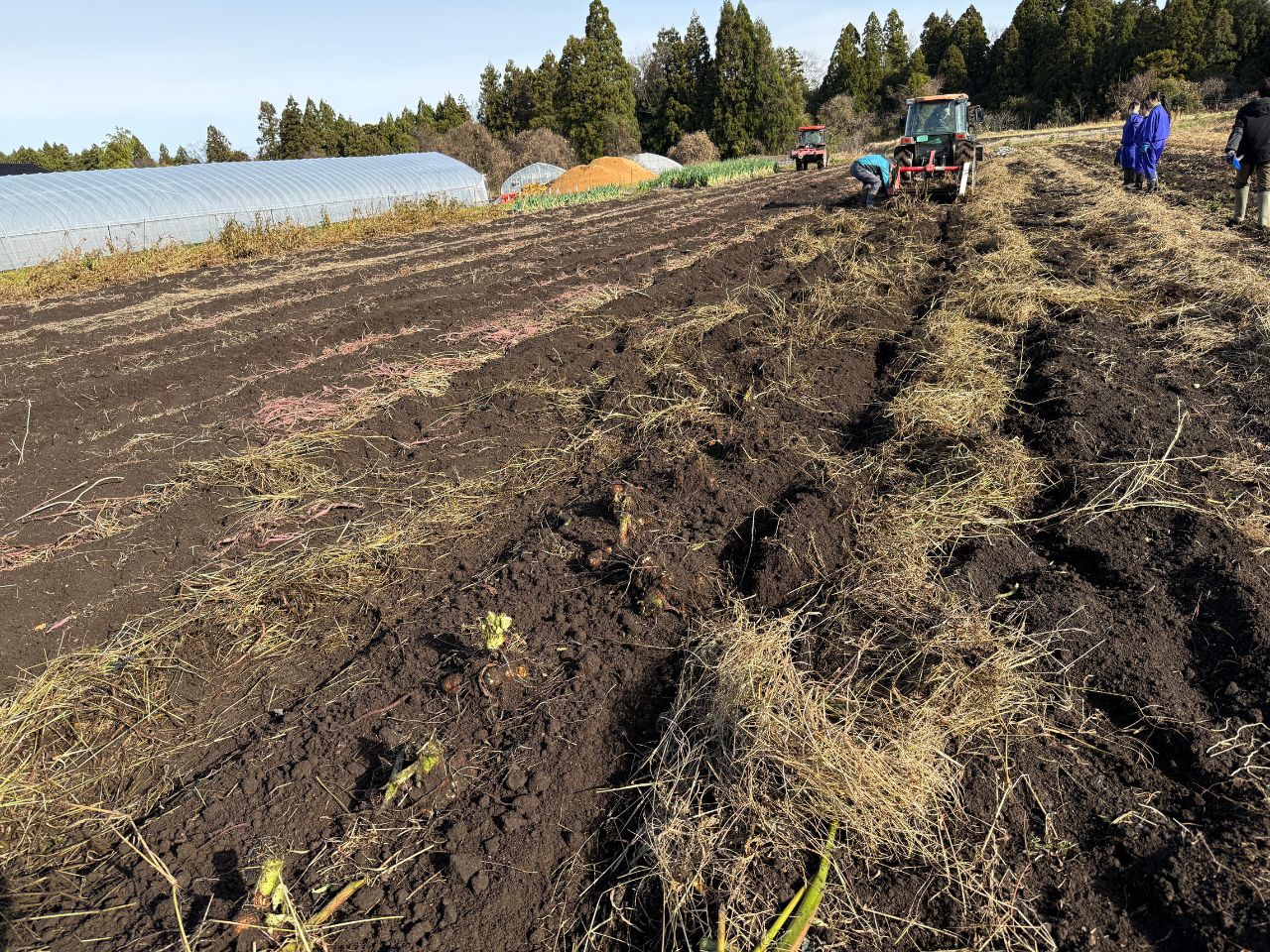 今回、手掘りで里芋の株を掘り起こしましたが、通常はトラクターを用いて機械で里芋の株を掘り起こしているということでした。